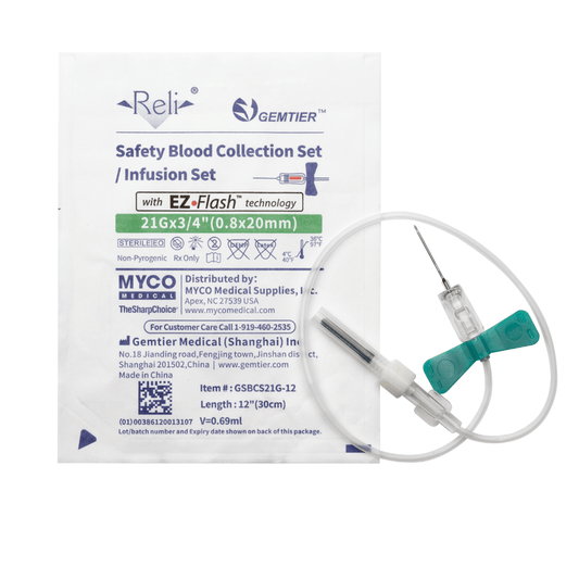 Myco Medical GSBCS21G-12 - RELI® SAFETY BLOOD COLLECTION SETS with EZ-Flash® Technology, 21G x ¾" Needle, 12" Tubing - UOM 100/BX